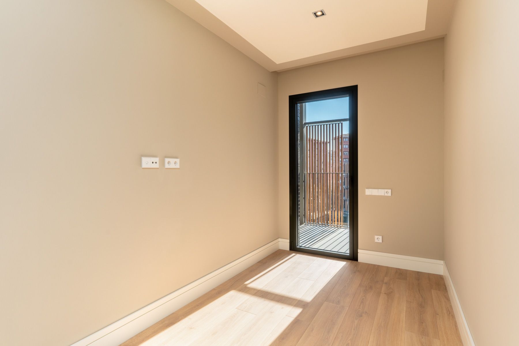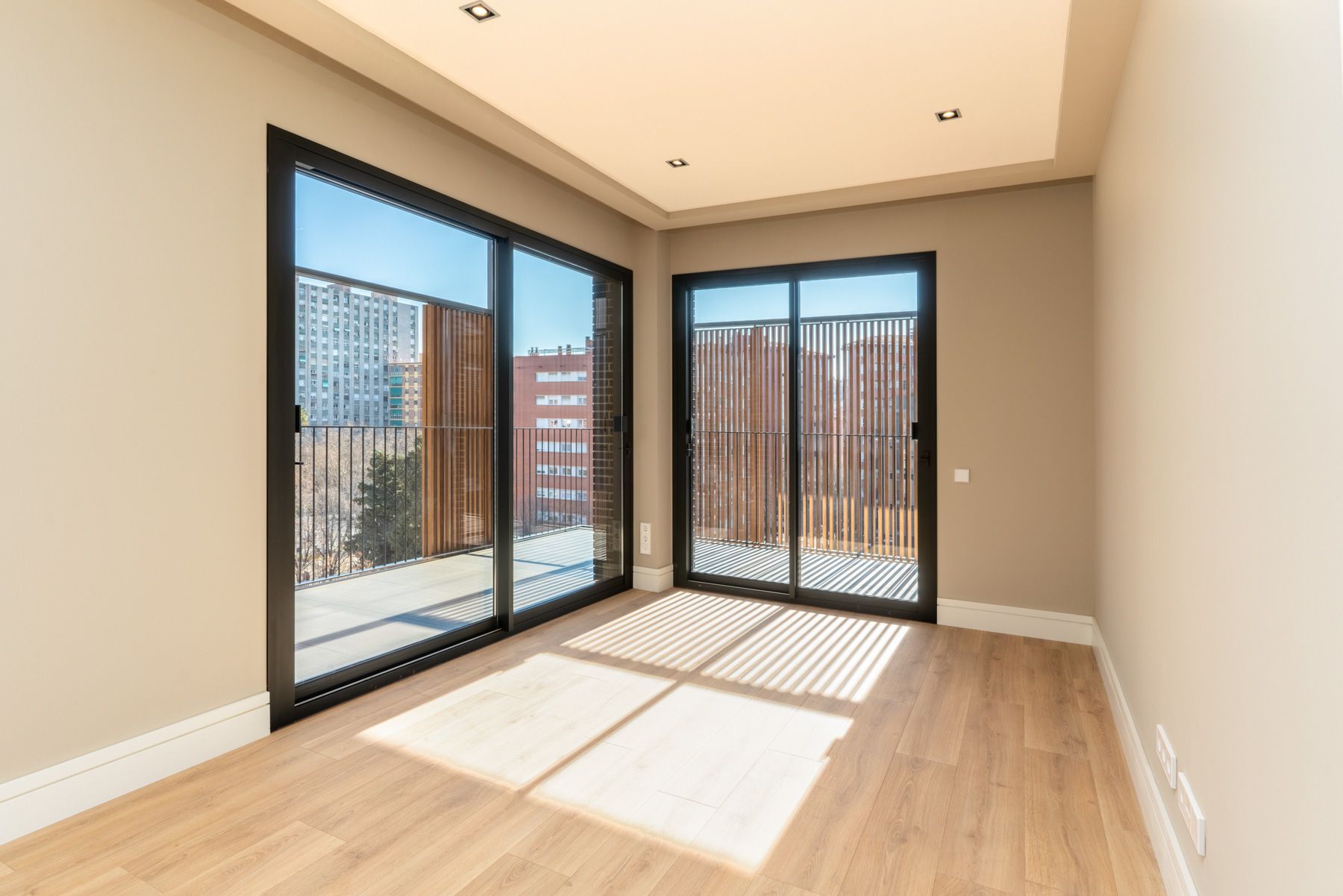 Todas las viviendas cuentan con terraza o balcón con cerramientos de lamas de aluminio para proteger de la radiación solar y matizar el contacto directo con la calle.