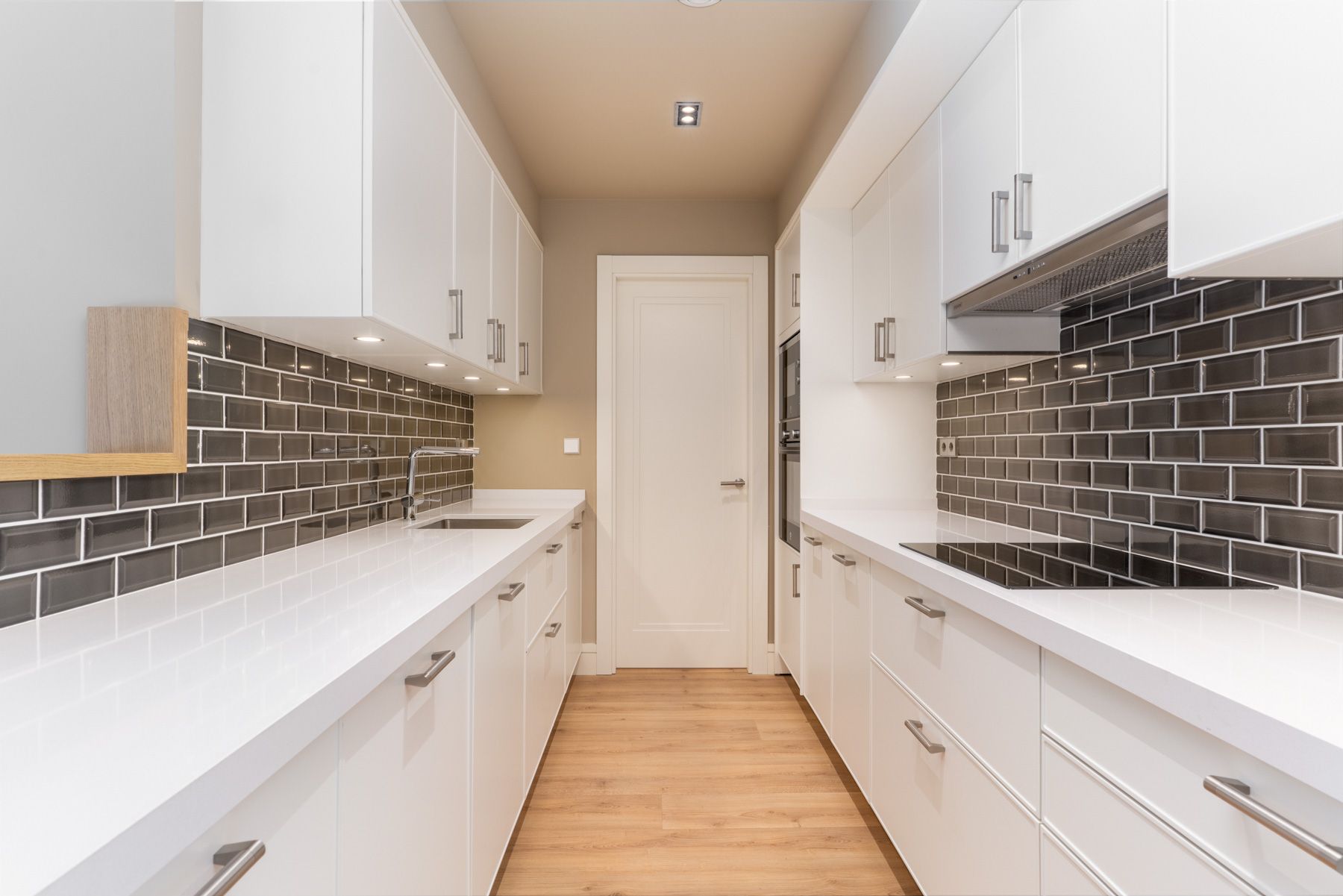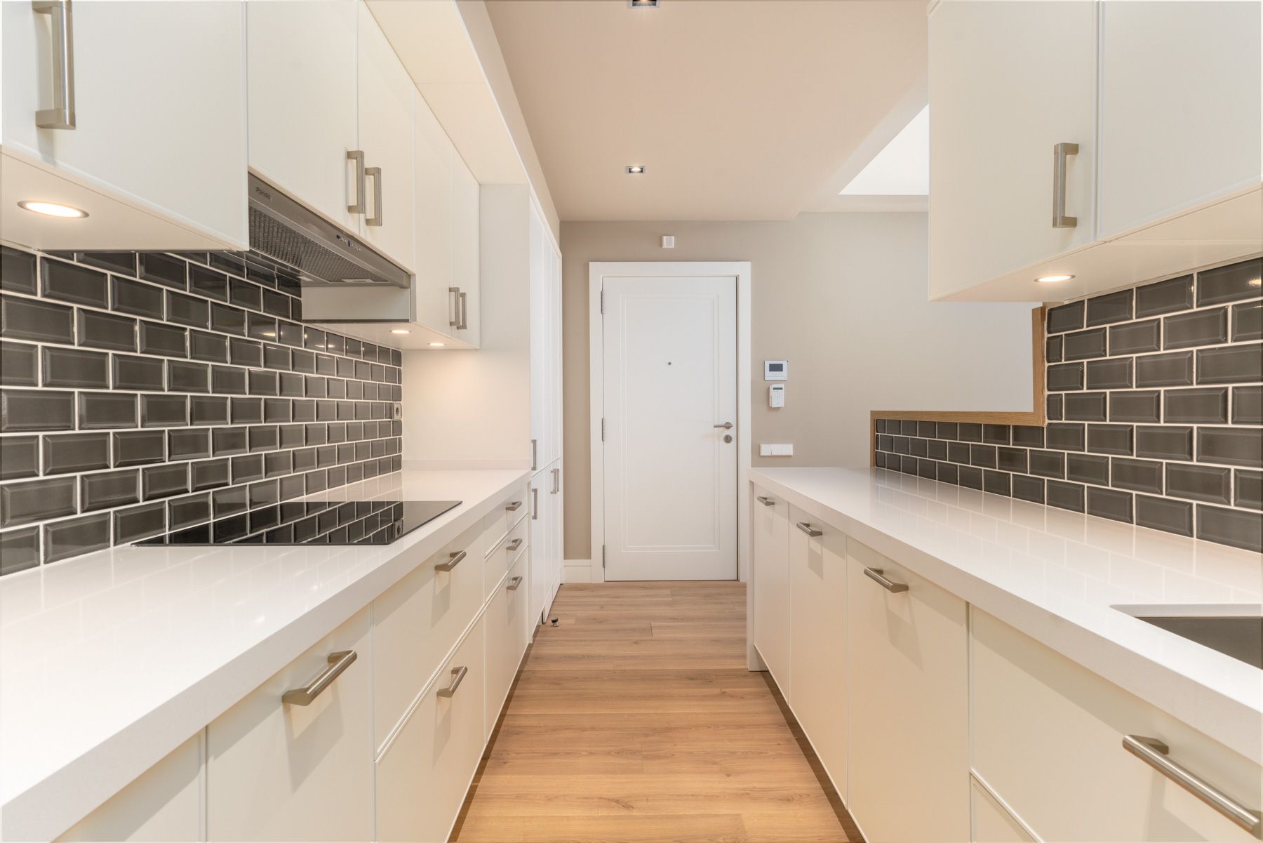 Cocinas office o americanas, 100 % equipadas con electrodomésticos integrados: nevera, lavavajillas, horno, microondas, campana extractora, placa de inducción lavadora y secadora. Algunas viviendas también disponen de cuarto lavadero.